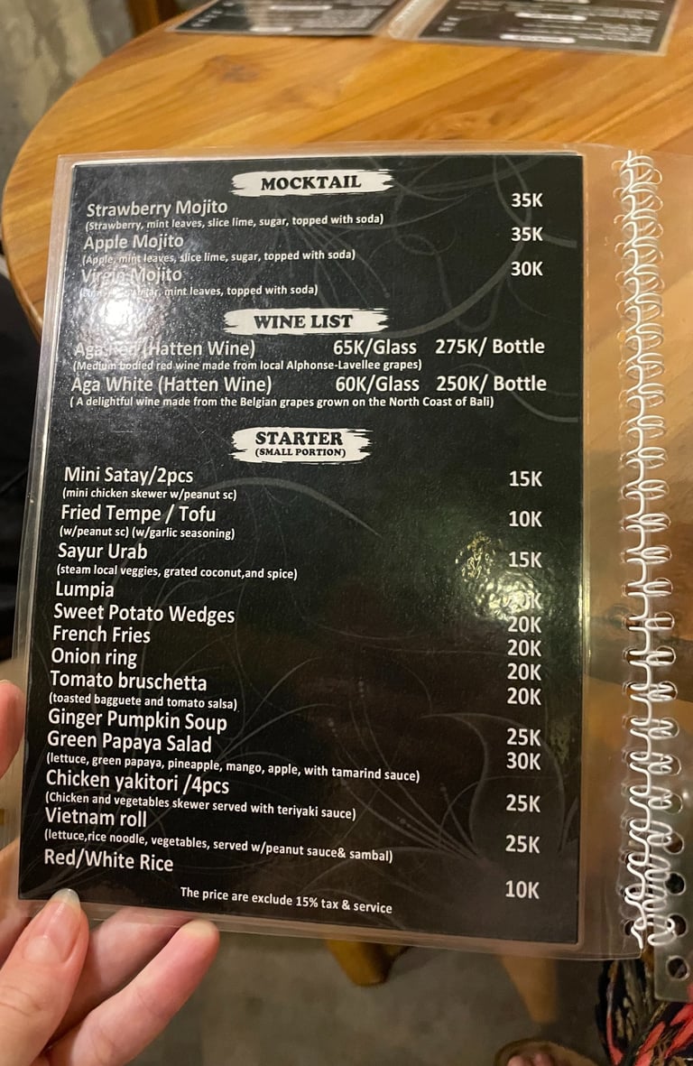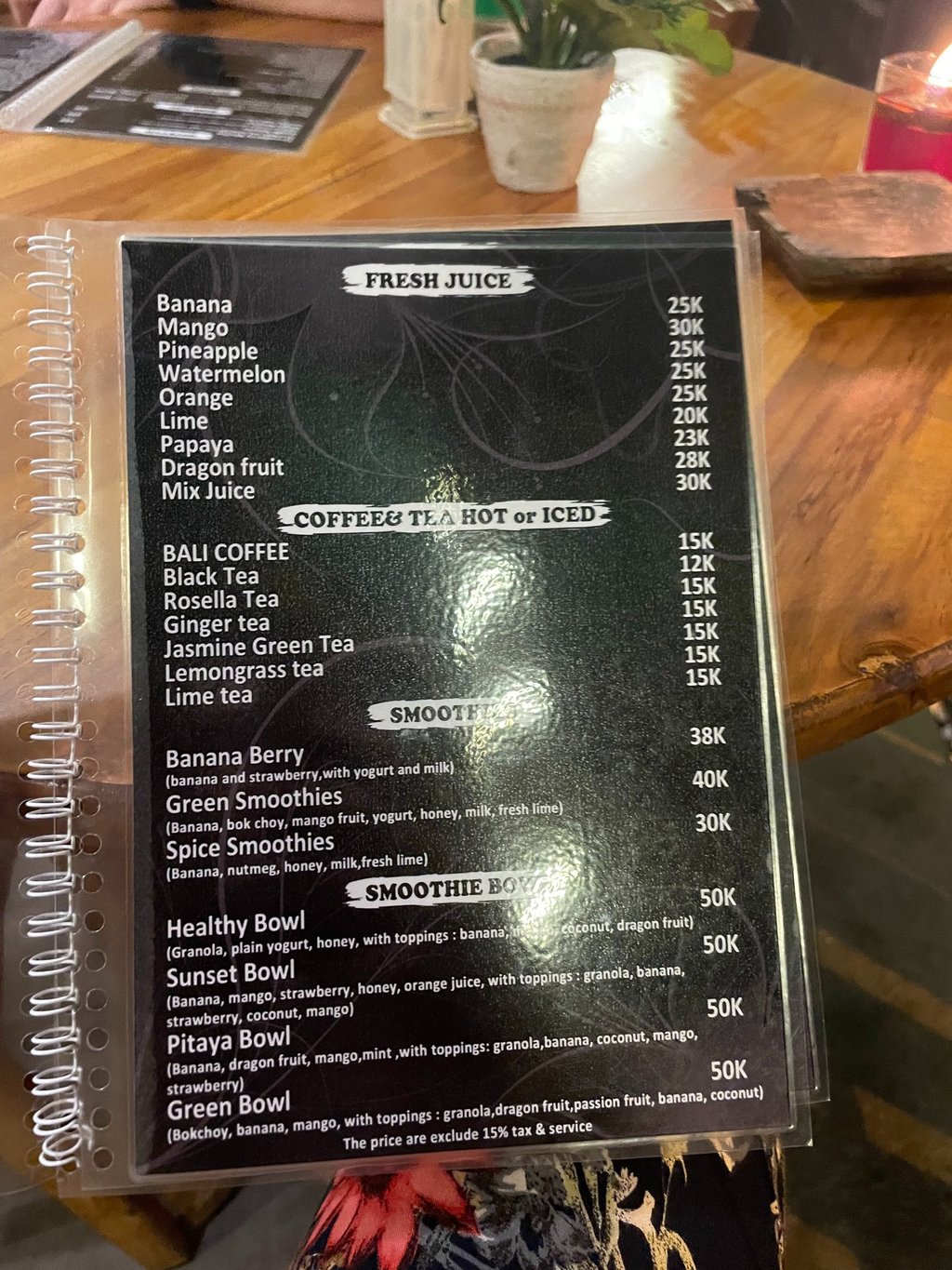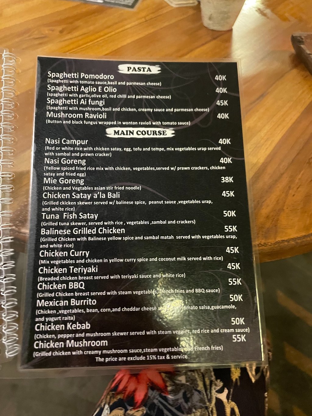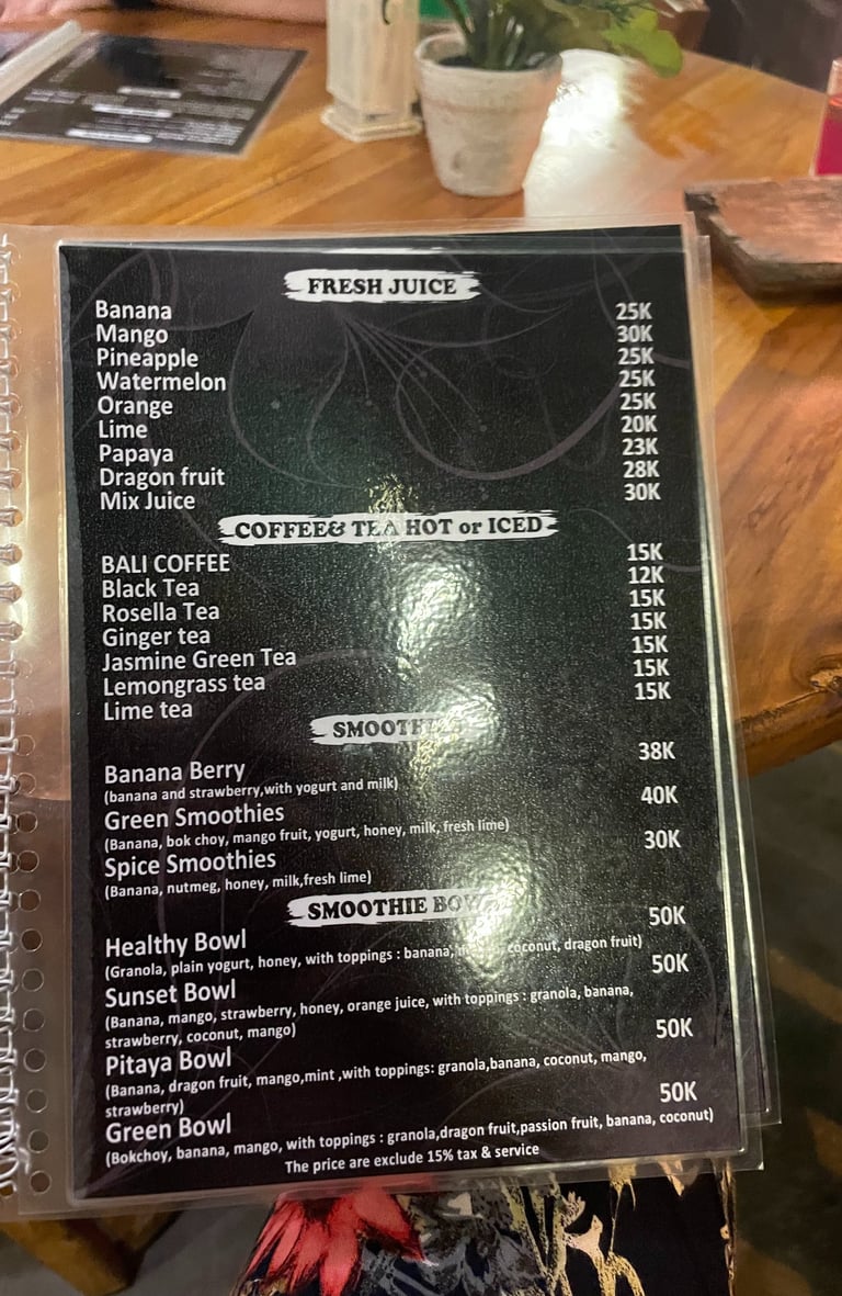 Dla przykładu dodaję zdjęcia menu i wystroju jednej z naszych ulubionych knajpek w Ubud. Zdjęcia obiadu są wyżej (zupka i sate pitu)