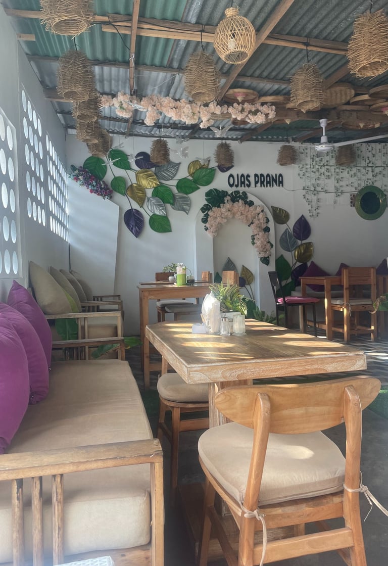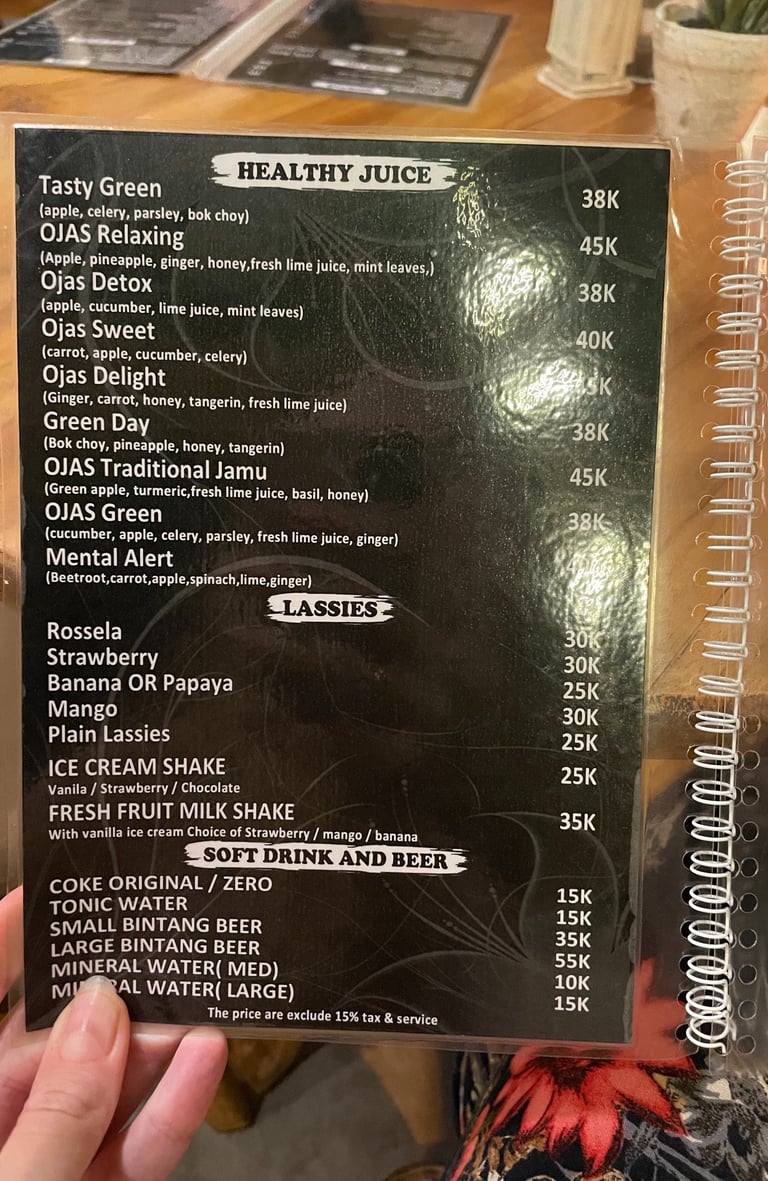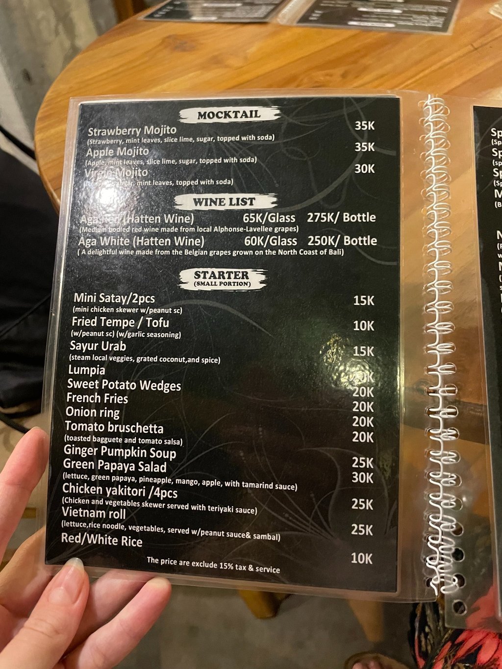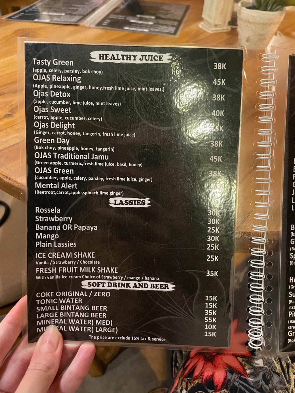 Dla przykładu dodaję zdjęcia menu i wystroju jednej z naszych ulubionych knajpek w Ubud. Zdjęcia obiadu są wyżej (zupka i sate pitu)