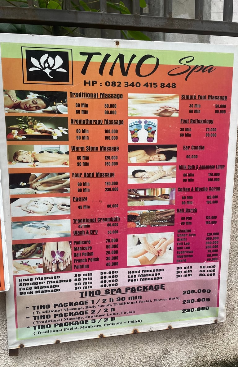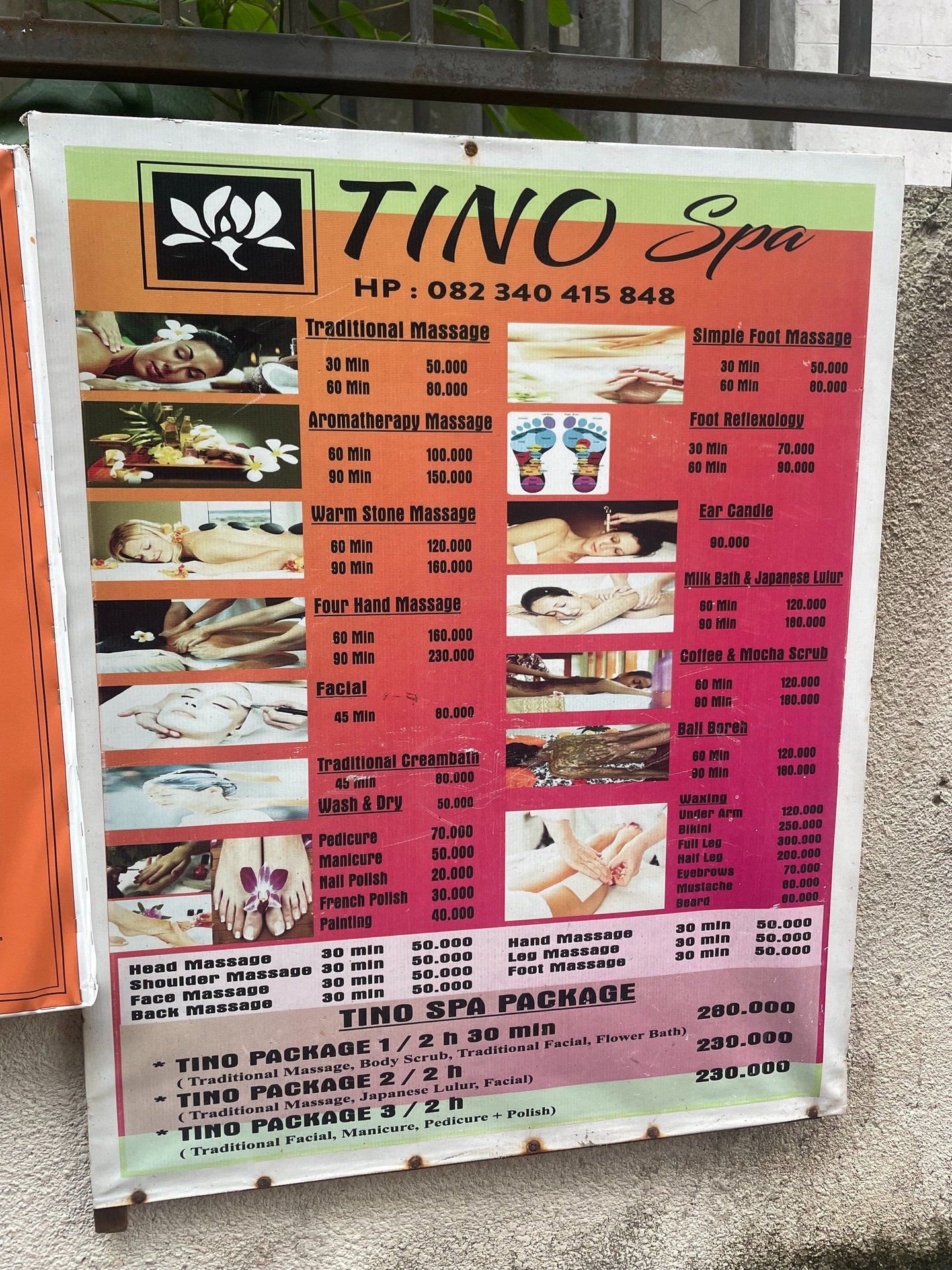 I tutaj oczywiście każdy orze jak może... Nie ma górnej granicy i nie ma jednej ceny. Mogę Wam polecić w Ubud w samym centrum jedno świetne miejsce gdzie panie masują tak dobrze, że musimy powiedzieć że był to TOP masaży jakie mieliśmy w Azji. Podrzucam zdjęcie cen, bo jak na centrum miasta, były naprawdę atrakcyjne. Od 14 zł za pół godziny.