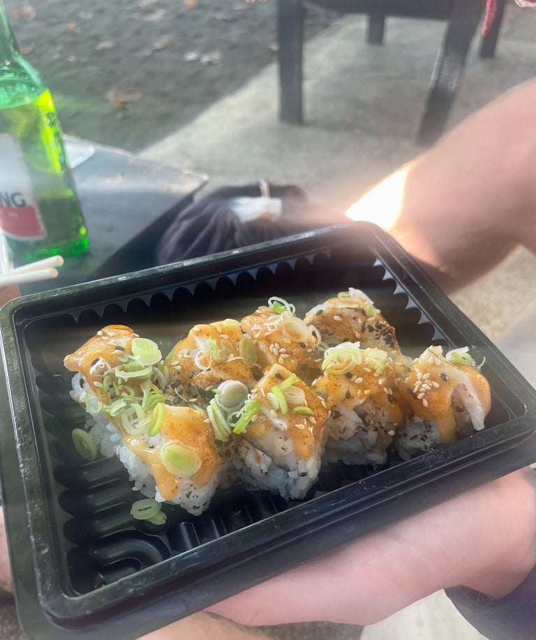 A tutaj fotka pysznego sushi za 5 zł, które jedliśmy na plaży w Lovinie, na której akurat odbywał się festyn. Pan opalał mięsko z kraba na świeżo przy nas. Jedno z lepszych, jakie jedliśmy kiedykolwiek. Fota rozmazana, bo już nam ślinka ciekła 😀