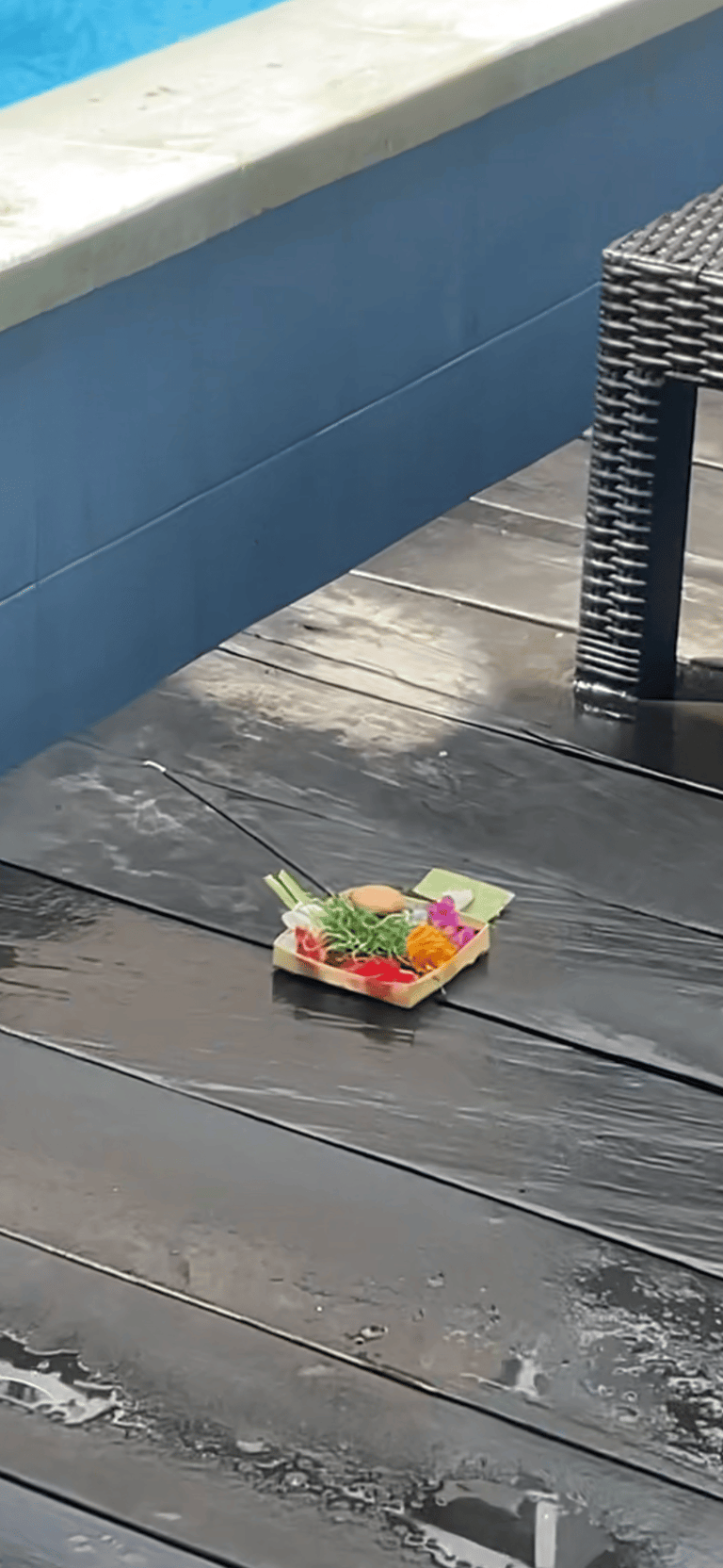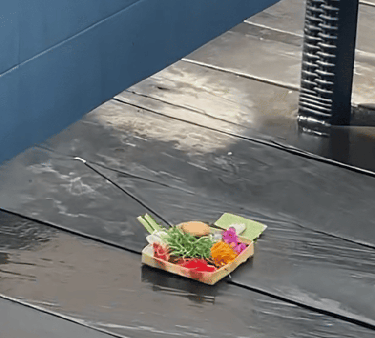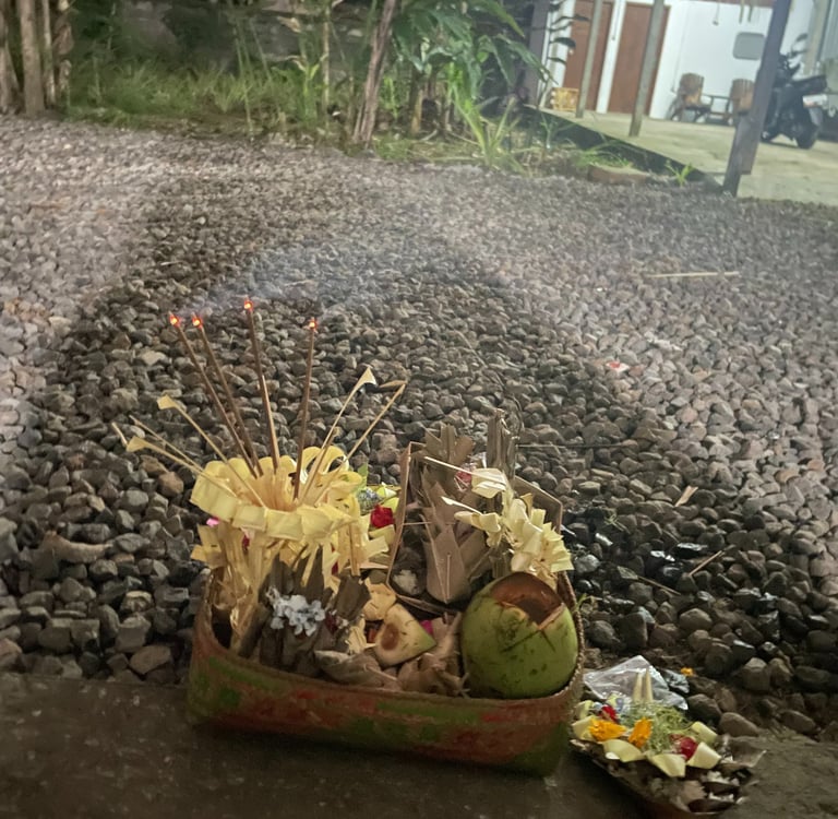 Pierwsza rzecz, to wspomniane dary (tzw. Canang Sari) - które (głównie balijki) składają codziennie rano i wieczorem w różnych miejscach, zarówno dla bogów, jak i demonów. Są dosłownie wszędzie! Przy pomnikach, świątyniach, na parkingu, przy wejściu do domu, przy sklepie, samochodzie, na chodniku, przy wodospadzie a nawet przy basenie. Są w postaci koszyczka z bambusa albo złożonego specjalnie liścia bananowca lub palmowego. W koszyczku natomiast znajdziemy ryż, kwiaty, kadzidełko, czasem są też słodycze, pieniądze czy nawet alkohol lub papierosy.