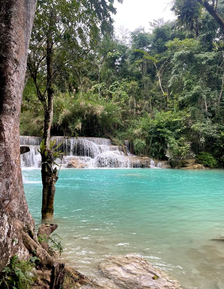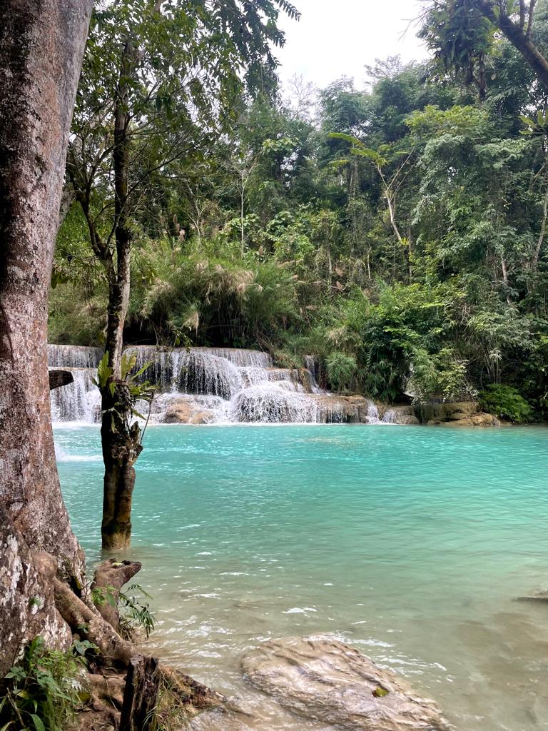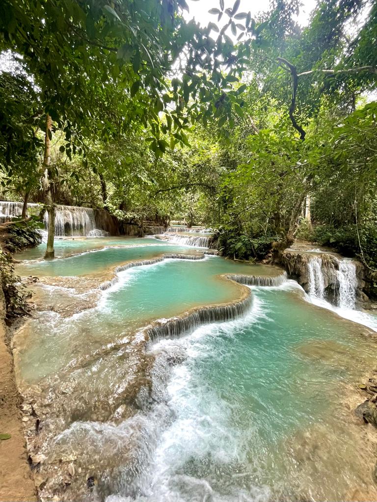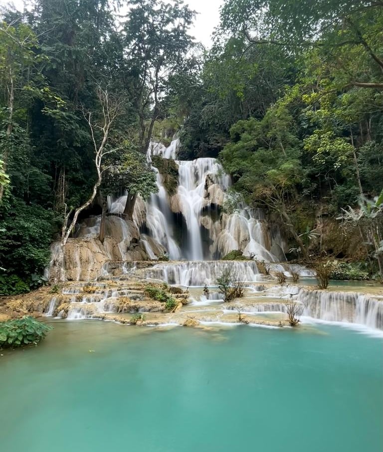 Jeden z piękniejszych wodospadów, jakie widzieliśmy. Znajduje się około 30 km od Luang Prabang. Wodospad ten składa się z serii kaskad, które spadają z wysokości około 60 metrów. Jedną z charakterystycznych cech Wodospadu Kuang Si jest turkusowy kolor wody, co jest spowodowane przez zawartość wapnia. Warto pamiętać, że kolor wody może się różnić w zależności od pory dnia - w godzinach porannych lub wieczornych, gdy słońce jest nisko na niebie, kolor może być bardziej intensywny niż w południe, gdy słońce jest wysoko, a także w zależności od pory roku - podczas pory deszczowej, gdy opady deszczu są większe, woda w wodospadzie może być bardziej mętna i ciemniejsza ze względu na spłukiwanie osadów z otaczającej wodospad dżungli. To miejsce warto zatem odwiedzić zatem z rana w porze suchej, kiedy to woda może być czystsza i o intensywniejszych barwach.