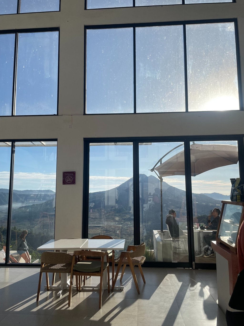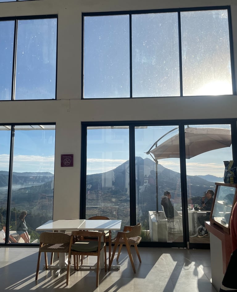 Druga wycieczka, jak już wiecie, była niejako wymuszona przez mgłę, która ostatnio niemiło nas zaskoczyła, dlatego udało się wytargować cenę 400 000 IDR za samochód z kierowcą. Pojechaliśmy dokładnie do tej samej kawiarni co wcześniej - tym razem już z przepięknym widokiem na oba wulkany 😍